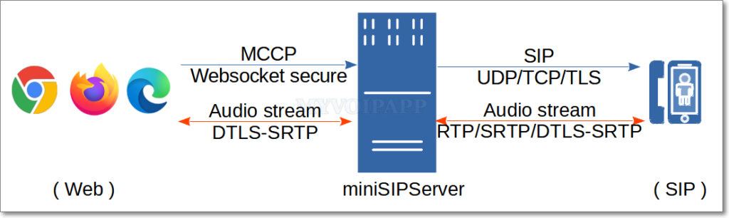 The audio stream is transmitted over DTLS-SRTP with end-to-end negotiation and encryption, requiring no additional configuration on miniSIPServer.