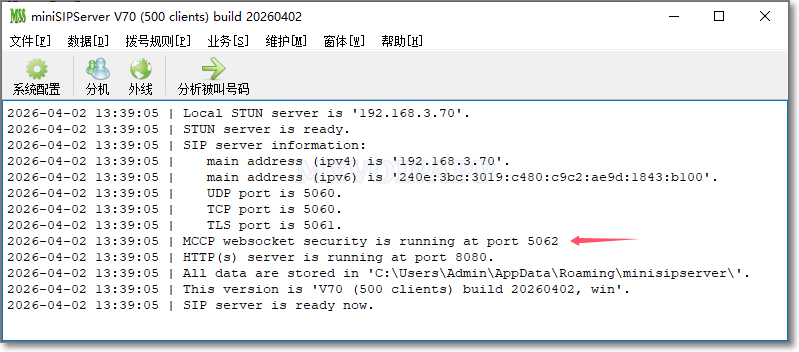 如果正常加载证书和密钥,miniSIPServer 将启动 WSS 服务并提示以下信息: